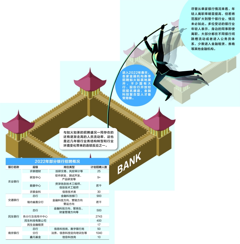 与如火如荼的招聘盛况一同存在的还有逐渐走高的人员流动率,这也是近几年银行业务结构转型和行业环境变化带来的连锁反应之一:大批银行基层岗位的员工不再把一家银行的“铁饭碗”一拿就是一辈子,尤其是年轻银行人的离职率大幅提高。