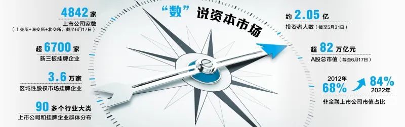 截至目前,中国资本市场拥有超过4800家上市公司、6700多家新三板挂牌企业,和3.6万家区域性股权市场挂牌企业。上市公司和挂牌企业群体分布在90多个行业大类,成为中国经济的“基本盘”,非金融上市公司市值占比从2012年的68%上升至当前的84%。科创板设立以来,IPO融资金额已占同期A股的近一半。随着京津冀、粤港澳大湾区、长三角区域一体化等国家战略深入推进,资本市场助力区域协同发展的作用日益增强。