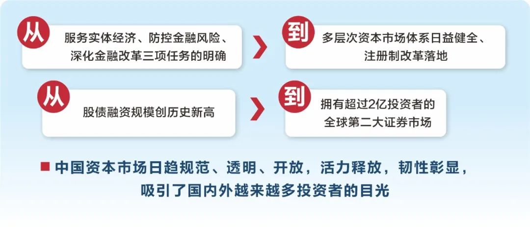 从服务实体经济、防控金融风险、深化金融改革三项任务的明确,到多层次资本市场体系日益健全、注册制改革落地;从股债融资规模创历史新高,到拥有超过2亿投资者的全球第二大证券市场,中国资本市场日趋规范、透明、开放,活力释放,韧性彰显,吸引了国内外越来越多投资者的目光。