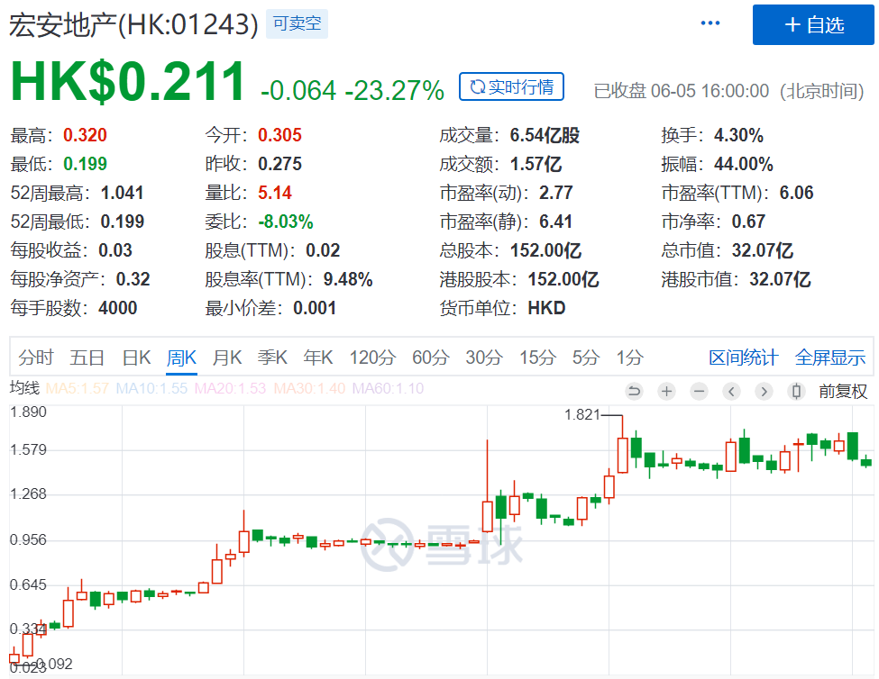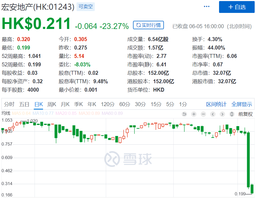 继6月4日暴跌68.7%之后,今日宏安地产(01243.HK)继续狂泻,盘中一度暴跌超27%,截止收盘,其股价跌幅仍高达23. 27%,短短2个交易日跌幅超过76%,已两度腰斩。