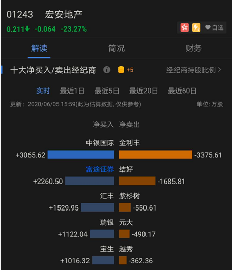 据富途证券数据显示,砸盘最大的主力是金利丰证券,在闪崩当天(6月4日),金利丰累计抛售数量超5907万股,而今日数据显示,金利丰再度斩仓、抛售宏安地产多达3375.6万股,连续2个交易日卖出数量接近1亿股。