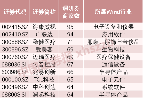 海康威视、广联达是今年前4个月接待券商调研家数最多的公司,分别有95家和94家,两家公司分属电子设备和仪器行业,以及应用软件行业;稳健医疗、爱美客、迈瑞医疗前4个月接待调研券商家数分别达到71家、69家、69家,三家公司均属于生物医药行业。
