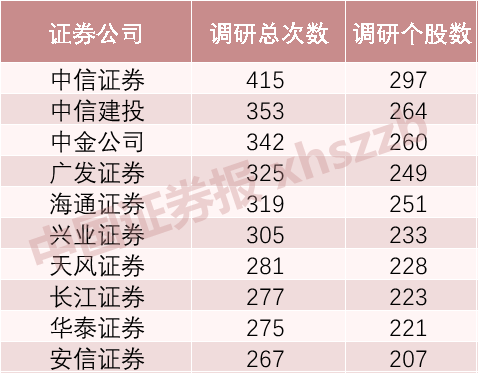 Wind数据显示,今年前4个月,中信证券共调研297家上市公司合计415次,调研次数及调研个股数均居行业第一,中信建投、中金公司、广发证券、海通证券、兴业证券位居前列。