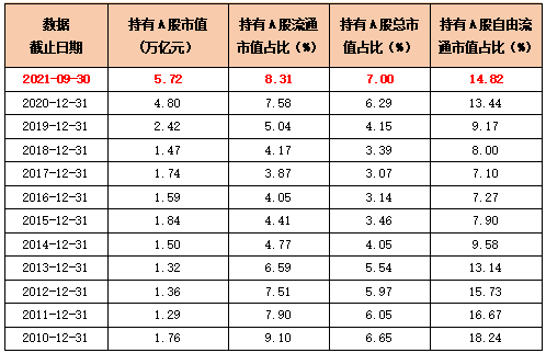中国银河证券基金研究中心数据显示,截至2021年三季度末,公募基金持有A股总市值5.72万亿元,占A股流通市值比例为8.31%,两项核心数据继续同步上行,为近十年来的最高水平。