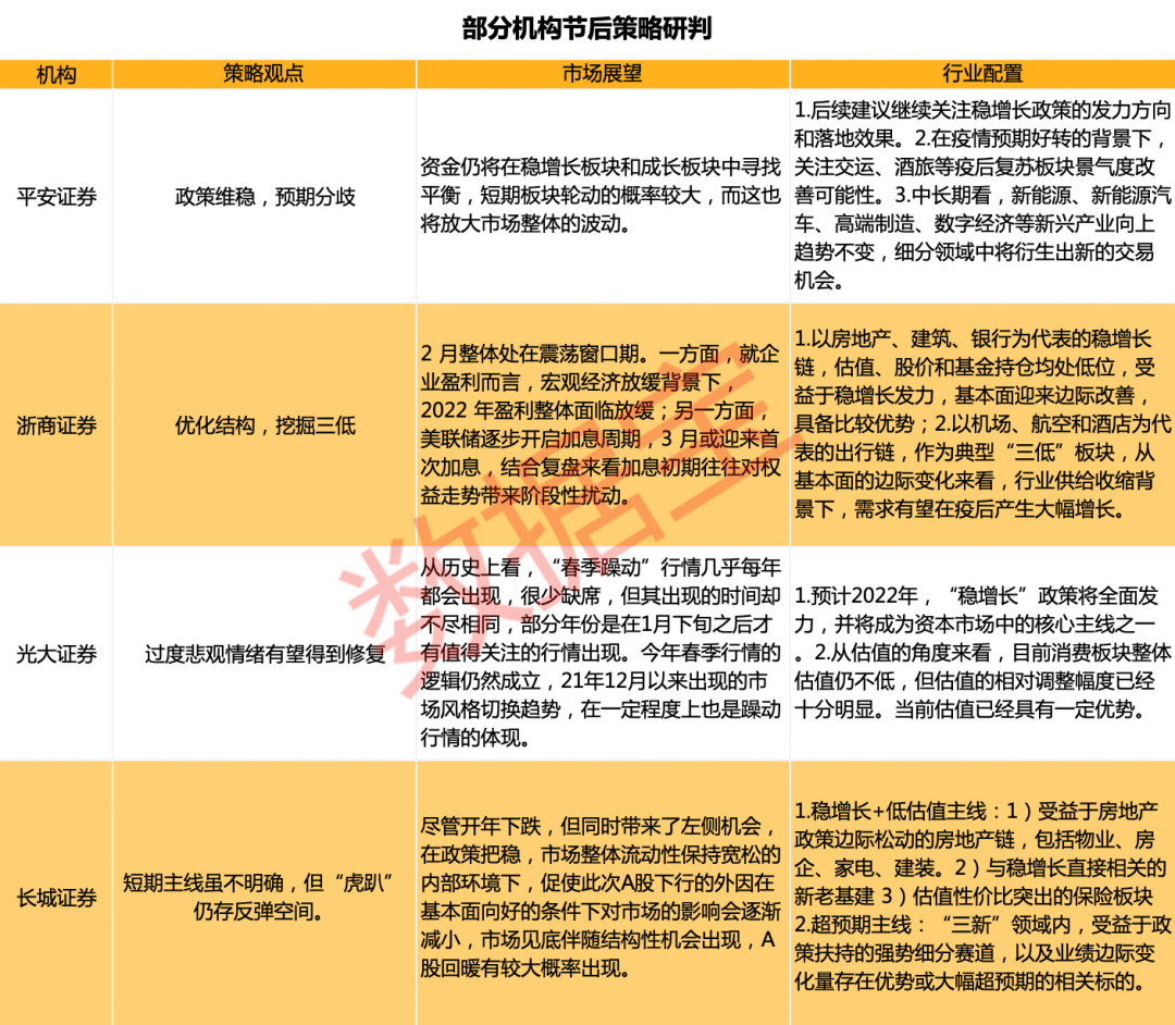 在行情下行期,机构仍对春节后行情保持乐观态度,期待反弹行情。多数机构认为,A股目前正处于调整的过程,市场悲观情绪有望在节后得到修复,有望出现“超跌反弹”行情。