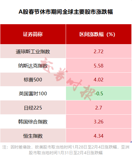 A股虎年春节长假休市期间,全球股市普遍上涨。