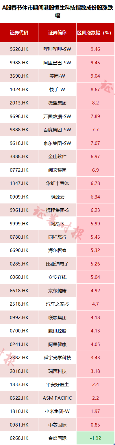 另外,A股春节休市期间,从恒生科技指数成份股来看,该指数的30只成份股中,仅1只股票下跌,其余29股全部上涨,其中18股涨幅超过5%,哔哩哔哩-SW、阿里巴巴-SW、美团-W、快手-W等大型互联网公司或大型电子商务平台公司股票涨幅领先。