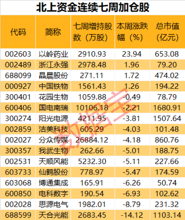 数据宝统计,16股获得北上资金连续七周加仓,其中国电南瑞、阳光电源、分众传媒最新持仓市值均在100亿元以上。