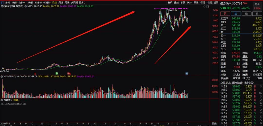 德方纳米三年前2019年4月15日在A股创业板上市,发行价41.78元,后复权(期间有高送转)目前最新股价可达969.4元,股价涨幅达22倍。目前最新股价为538元,总市值480亿元。