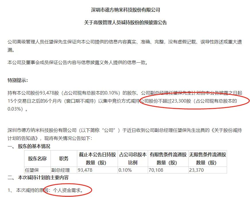 值得注意的是,在几大股东解禁前夕,德方纳米高管提出了减持预案,拟减持不超过2.33万股,减持原因是个人资金需要。