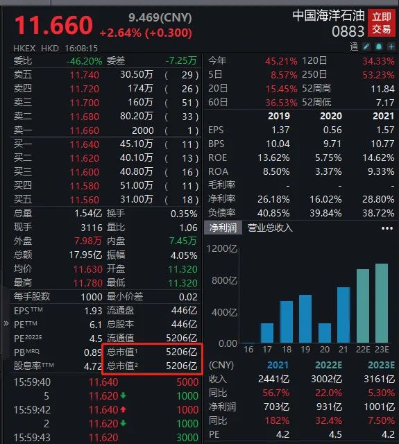 中国海油目前在H股的股票中国海洋石油最新股价为11.66港元,总市值5206亿港元。