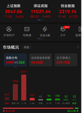 受政策面利好提振,A股三大指数午后大幅拉升。沪指收复3000点关口,收涨2.41%;深成指、创业板指双双涨逾3.5%。互联网、房地产、半导体、券商板块等午后直线拉涨,电商板块掀涨停潮。港股也应声大涨,恒生科技指数收涨9.96%,恒生指数涨4.01%,阿里、京东、美团等互联网巨头集体涨超15%,腾讯控股涨超11%。
