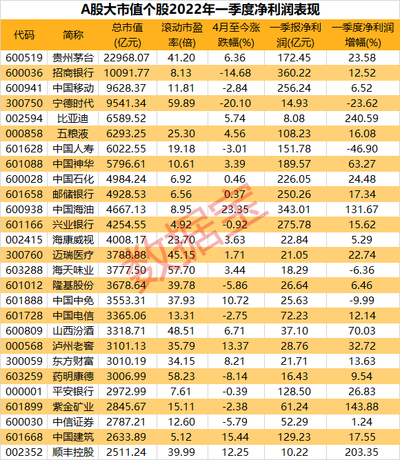 一季报披露接近尾声,除宁德时代外,大市值个股业绩浮出水面。截至发稿,证券时报·数据宝统计,A股市值超过2500亿元公司中,比亚迪、顺丰控股净利润增逾200%;紫金矿业、中国海油净利润翻倍。12家公司净利润超百亿,招商银行、中国海油最高,均突破340亿元,中国建筑、兴业银行两股最新估值较低,均不足6倍。