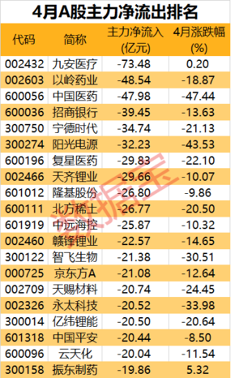 数据宝统计,3月31日至4月29日,A股主力净流出4453.08亿元。申万一级行业中,14个板块净流出额破百亿。医药生物居首,主力净流出769.76亿元;其后电力设备、基础化工额度在400亿元左右。唯一获主力净流入的板块是石油石化,额度65.62亿元。该板块中,近期回A的中国海油最受青睐,上市7日主力净流入额达到96.48亿元,累计涨幅57.5%。