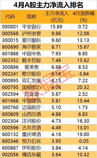 4月净流入超亿元的个股有120余只,平安银行净流入额最高,达到15亿元。主力回流白酒股态势明显,泸州老窖净流入额近10亿元;山西汾酒、洋河股份、古井贡酒在4亿元以上。除去山西汾酒,其余3股涨幅均在12%以上。