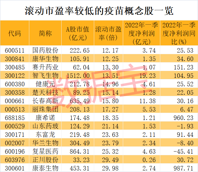 疫苗概念股今年以来经过多次调整,目前估值水平进一步下移。数据宝统计,截至4月30日收盘,超半数疫苗概念股滚动市盈率低于30倍。国药股份、康华生物、赛升药业、智飞生物、健康元等5股滚动市盈率不足15倍。