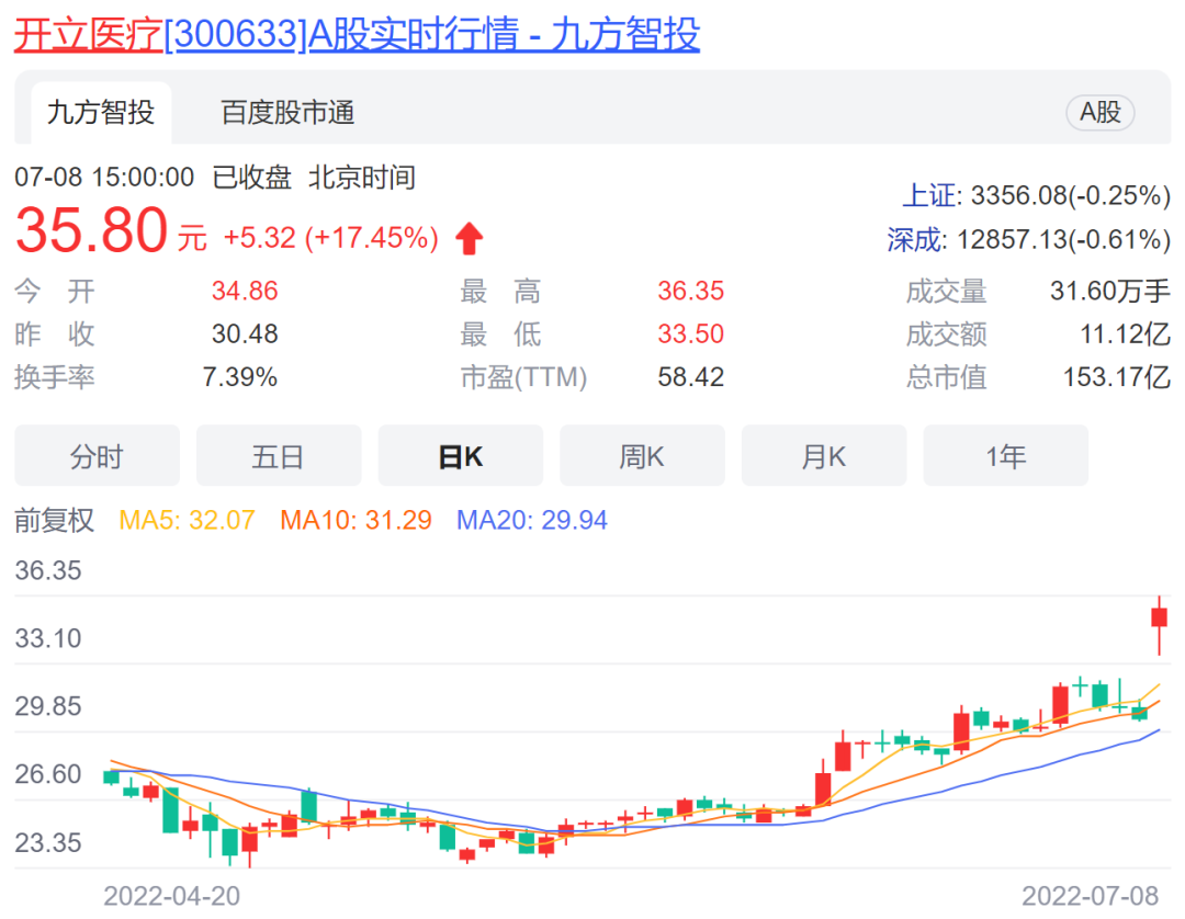 随后7月8日,开立医疗股价大涨17.45%,结束此前4个交易日的下跌,全周上涨11.7%,收于35.8元/股,当前市值约153亿元。从当日盘后数据看,多家机构专用席位现身龙虎榜,机构合计净卖出1341.41万元。此外,北向资金合计净买入1.25亿元。