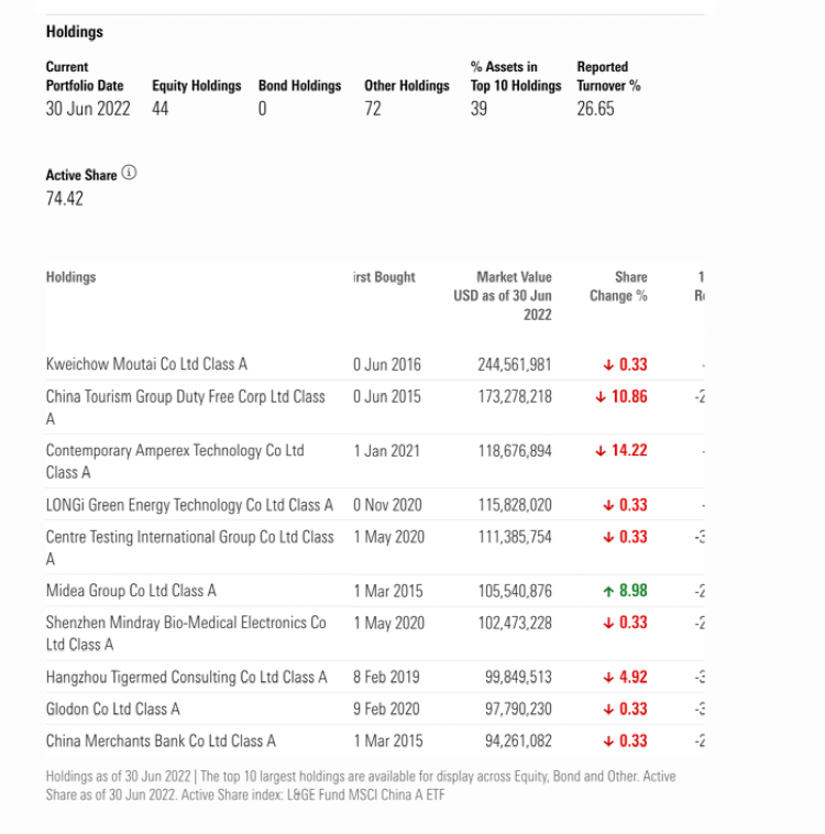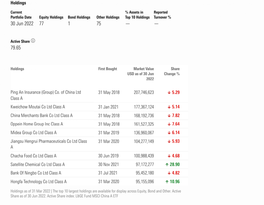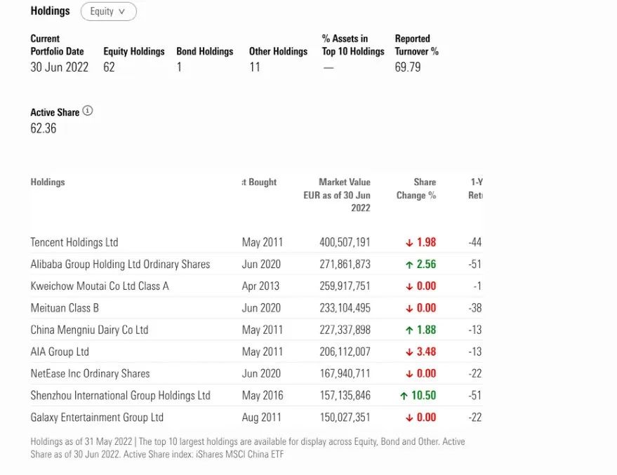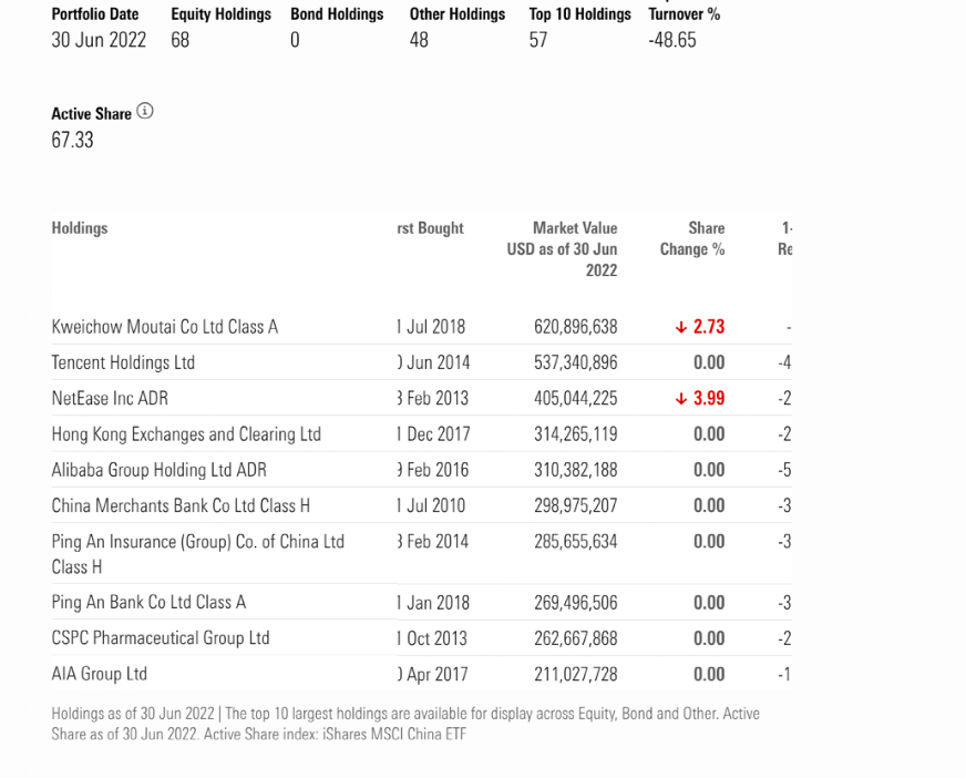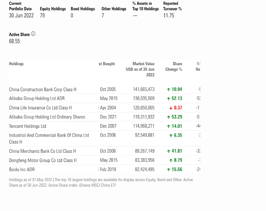 截至2022年6月底,基金的前十大重仓股为建设银行、阿里巴巴(ADR)、中国人寿、阿里巴巴(港股)、腾讯控股、工商银行、招商银行、东风汽车、百度(ADR)等。
