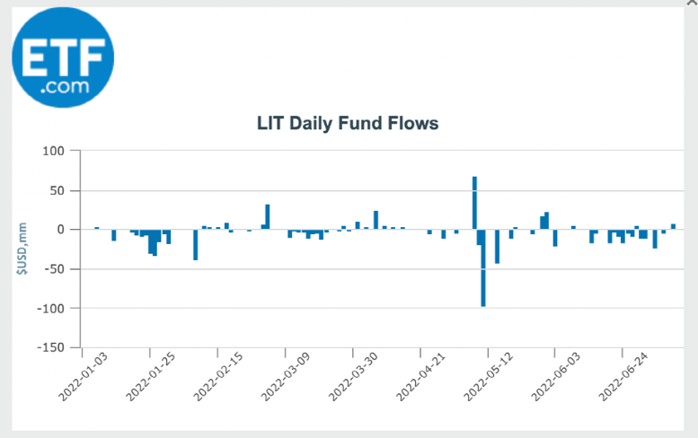 例如GlobalX旗下的锂电ETF LIT最新规模 44.1亿美元。ETF 2022年以来,净流出3.27亿美元。