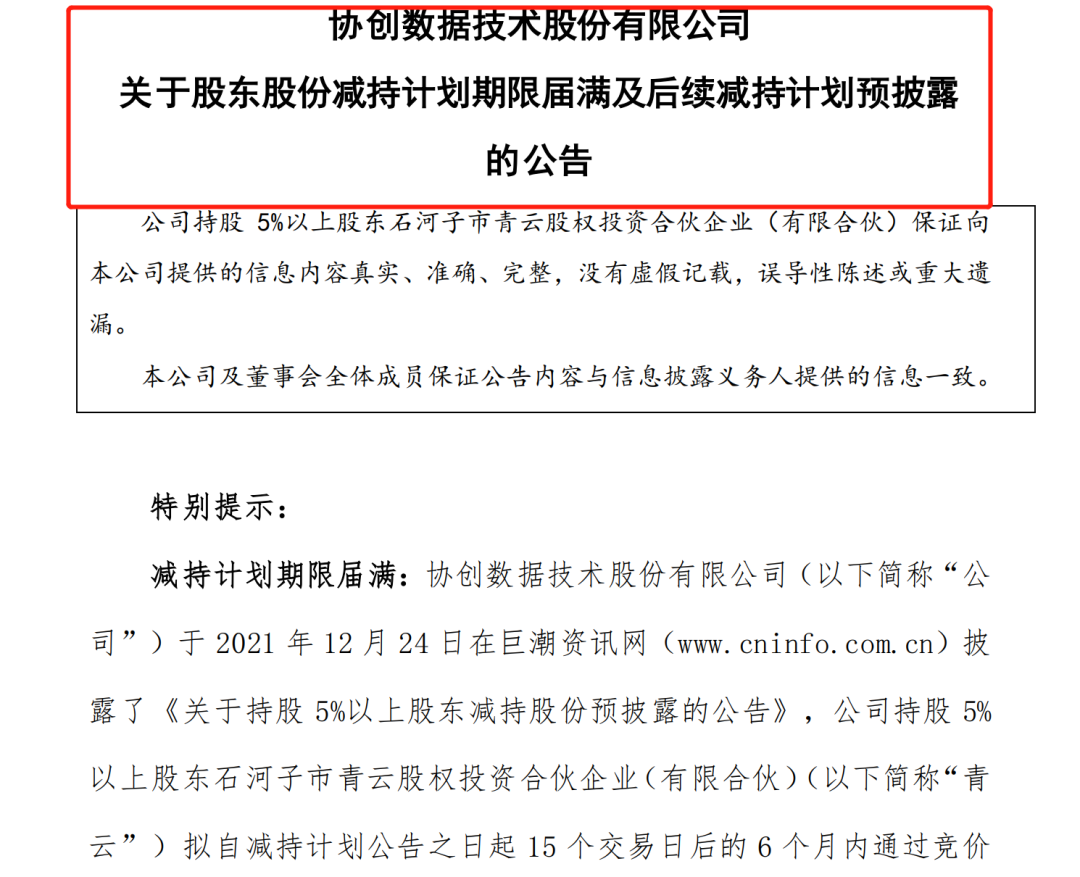 协创数据7月17日公告,公司于2021年12月24日披露股东石河子市青云股权投资合伙企业(有限合伙)的减持计划,该股东的减持计划至7月17日止。期间,石河子青云共减持了公司1.98%的股份。