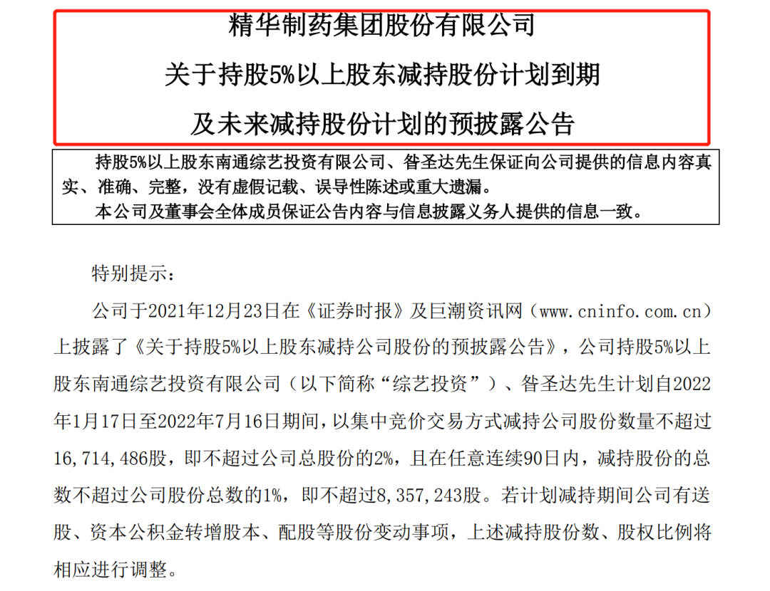 精华制药7月17日晚间也披露了股东的减持情况及后续减持计划。
