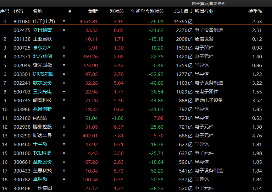 板块仍轮动活跃,电子板块全天强势领跑,涨幅超过3%。电子“大哥”立讯精密高开高走,最后收涨8.65%报33.53元/股,年内跌幅仍近32%;歌尔股份、闻泰科技涨幅均超过5%,斯达半岛涨近8%。