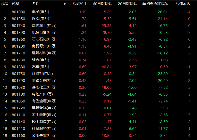煤炭、国防军工板块均涨近2%,华阳股份涨近8%,航发动力涨近2%;机械设备、石油石化、商贸零售涨幅也均超过1%,大族激光涨停,东方盛虹涨幅超过8%,中国中免收涨2.4%。