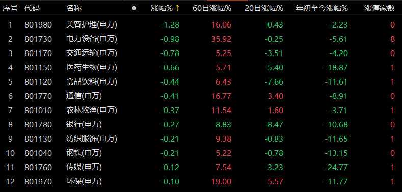 房地产板块微涨,银行板块微跌;大消费类板块仍表现弱势,食品饮料、医药生物、美容护理跌幅均约1%;汽车板块仍在上涨,而电力设备今日跌近1%。