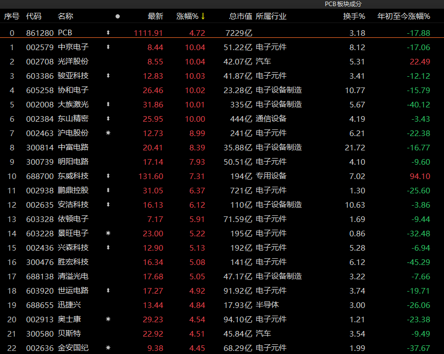 PCB(印制电路板)概念板块涨近5%,17只相关个股涨幅超过5%,其中东山精密、大族激光、协和电子、骏亚科技、光洋股份、中京电子涨停。