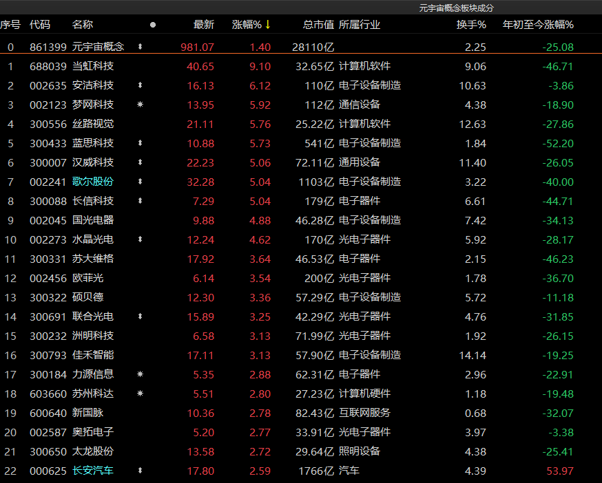 元宇宙概念板块也表现不错,当虹科技涨幅超过9%,汉威科技、蓝思科技、丝路视觉等个股涨幅超过5%。