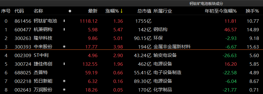 钙钛矿电池概念连续3天上涨,期间涨幅近11%。今日,相关个股杭萧钢构、隆华科技涨幅超过5%。