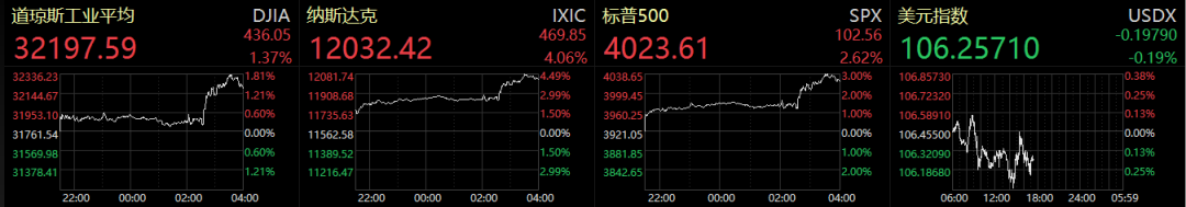 受此影响,美股反而大涨,道指收涨1.37%,纳指收涨4.06%,标普500收涨2.62%。美元指数走弱。