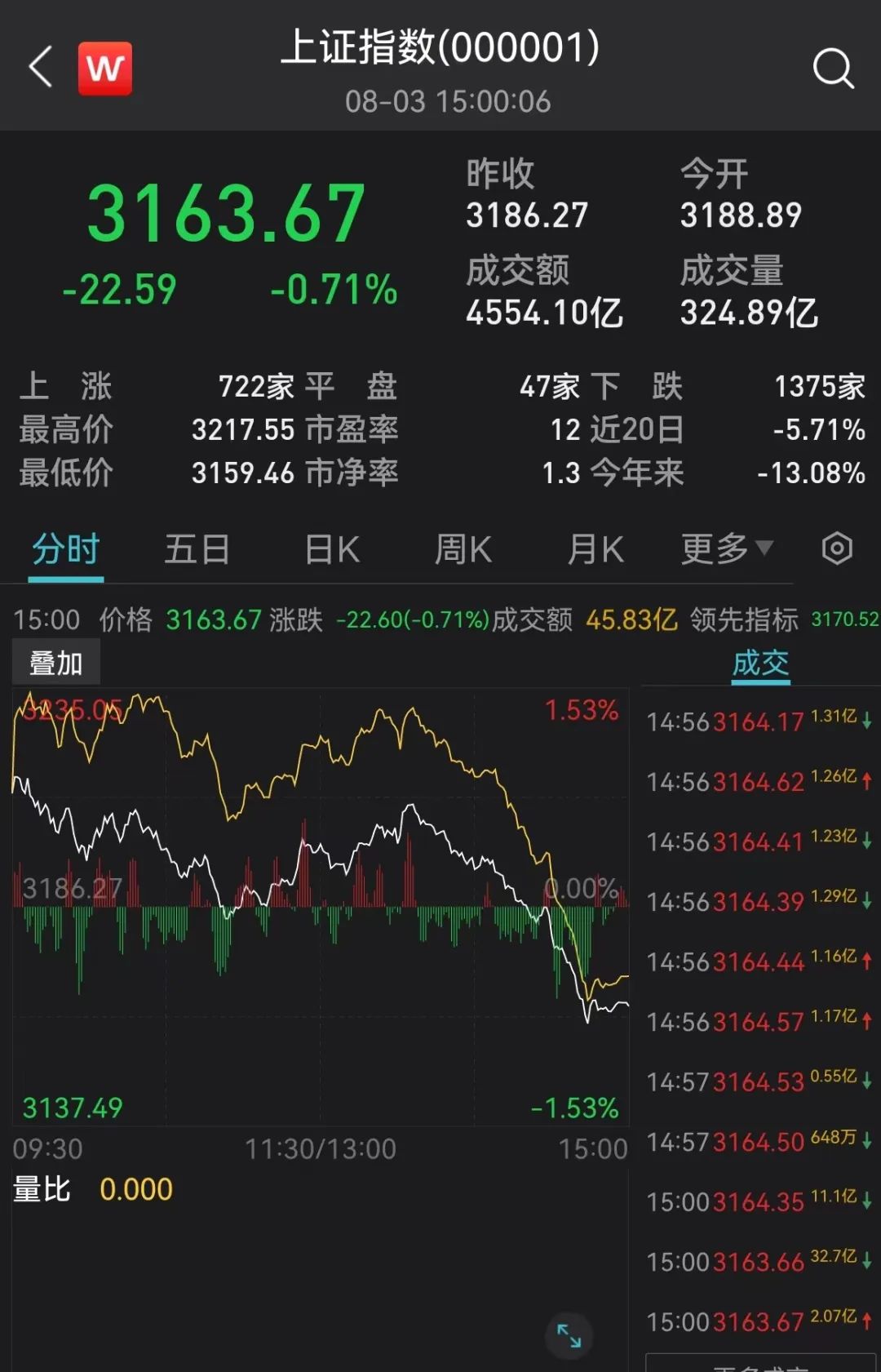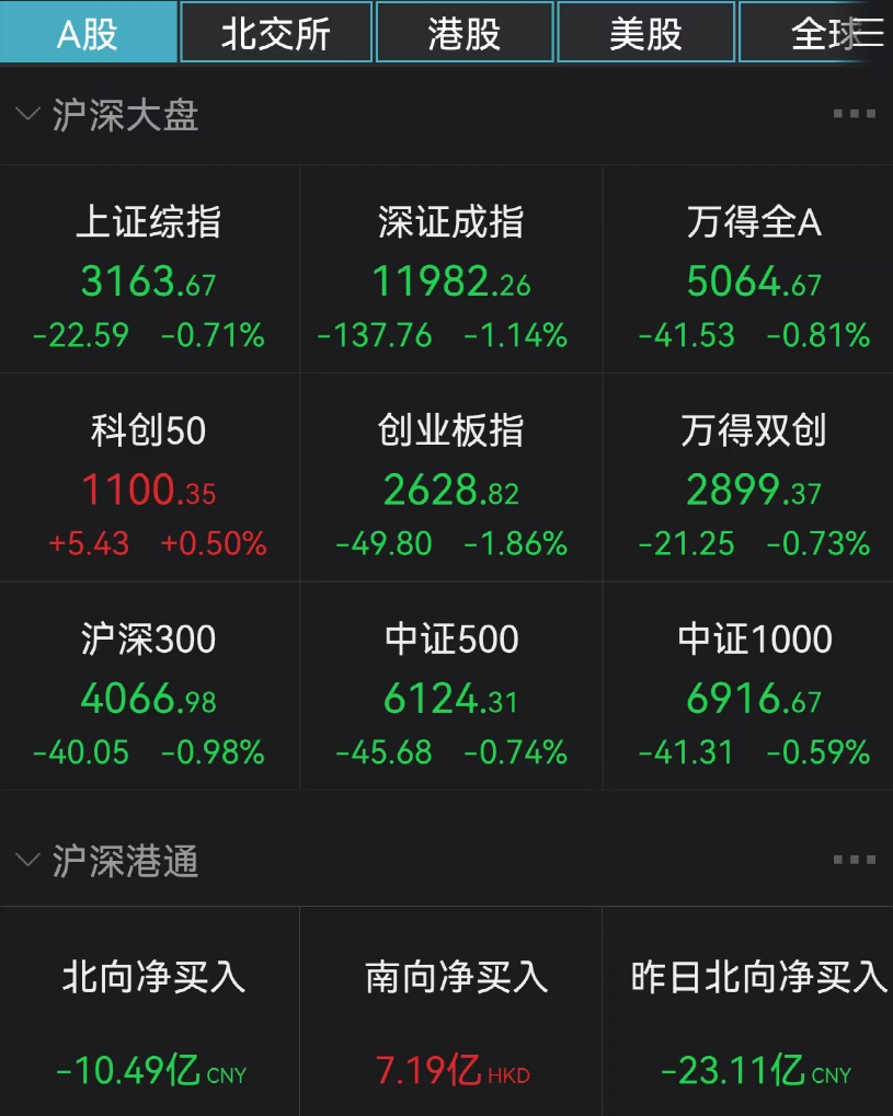 周三A股市场出现尾盘跳水,各大指数冲高回落,截止收盘上证综指跌了0.71%,报3163.67点,深证成指跌1.14%,报11982.26点,创业板指跌1.86%,报2628.82点。两市近3000只个股下跌,但军工板块保持强势;全天成交额达1.11万亿;但北向资金全天净卖出10.49亿元。