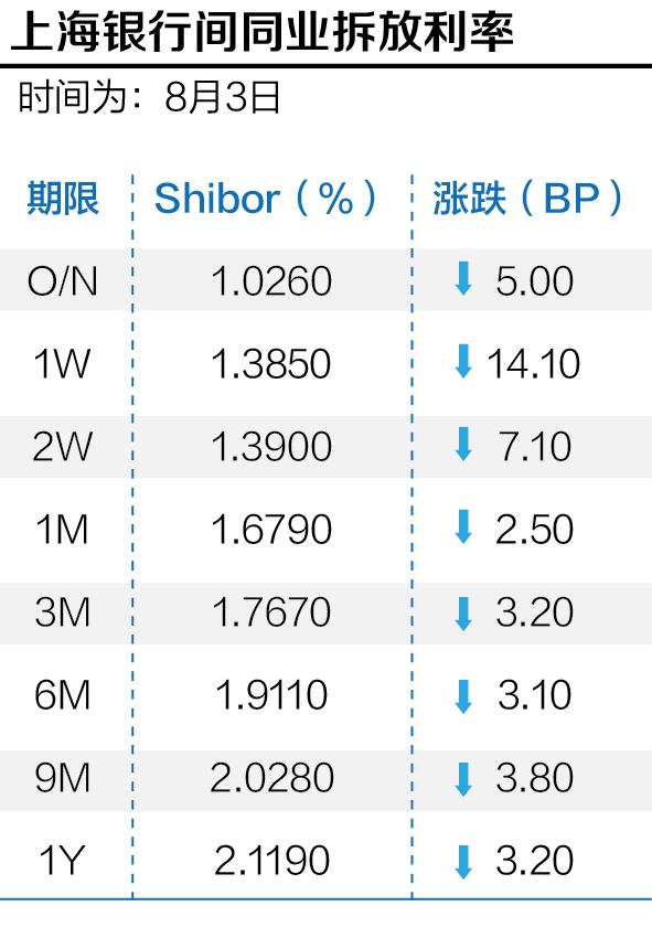 不过虽然逆回购缩量,但是市场的流动性依然宽裕。短端利率进一步下行,资金面持续宽松。上海银行间同业拆放利率(Shibor)隔夜下行5个基点,报1.026%。7天Shibor下行14.1个基点,报1.385%。此外二周、一个月、三个月、六个月的品种收益也都在2%之下。