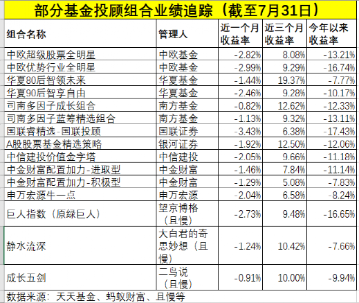 从公募基金的年内表现来看,前7个月偏股混合型基金和主动股票型基金业绩指数跌幅分别为14.08%和13.57%,偏股类基金投顾组合的跌幅主要集中在10%-13%之间,略低于公募基金平均跌幅。但是也有不少组合产品的表现优于公募基金的平均表现,例如华夏基金管理的华夏80后智领未来,今年以来的跌幅7.77%,大幅跑赢沪深300(-15.59%)和中证500指数(-14.48%)。而主要投宽基指数的基金大V,例如基金博格的巨人指数和银行螺丝钉的指数基金,今年以来的表现居然没有跑过沪深300和中证500。
