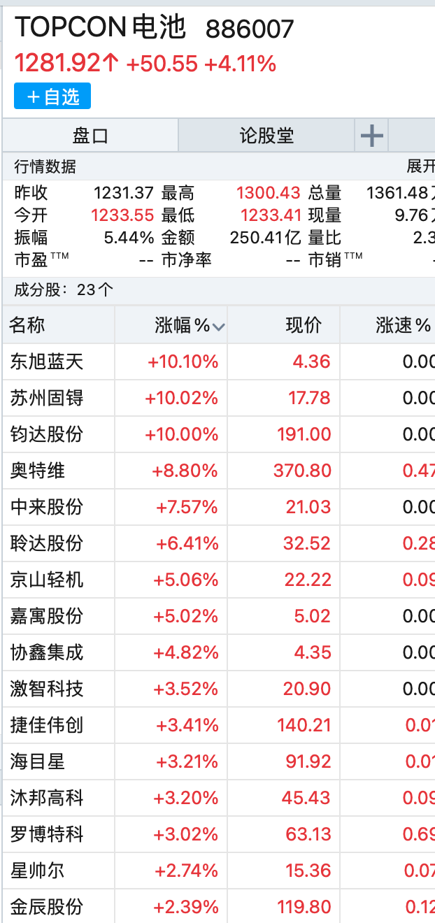 光伏板块今日走强,TOPCON电池概念股全天领涨,东旭蓝天、苏州固锝、钧达股份涨停,奥特维、中来股份、聆达股份涨超5%。
