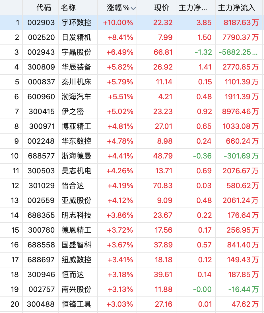 工业母机板块午后拉升,宇环数控涨停,宇晶股份、日发精机、秦川机床涨超5%。