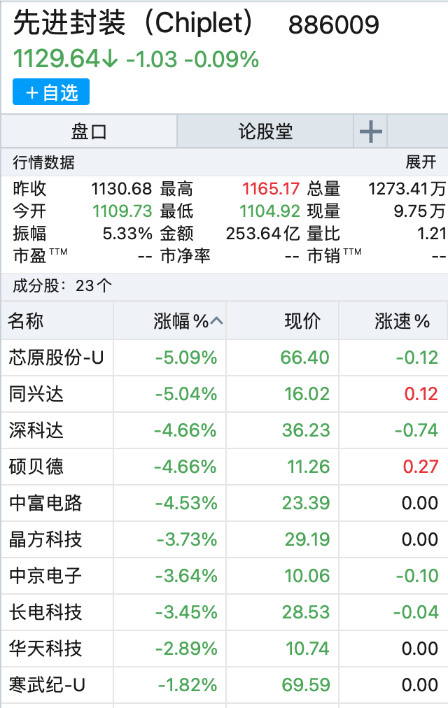 先进封装(Chiplet概念)午后持续走低,深科达、同兴达跌约5%。