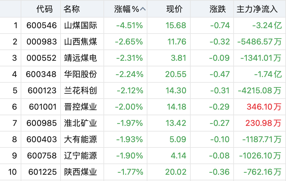 煤炭开采加工板块昨日现一日游行情,今日领跌两市,山煤国际跌超4%。