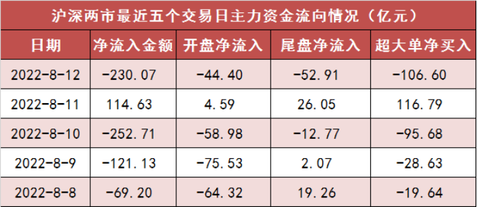 今日沪深两市主力资金开盘净流出44.4亿元,尾盘净流出52.91亿元,两市全天资金净流出230.07亿元。