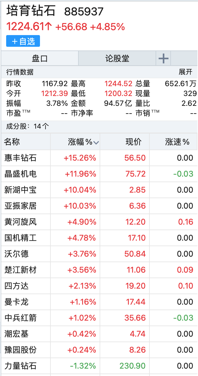 培育钻石板块全天领涨,晶盛机电、惠丰钻石涨超10%,新湖中宝、亚振家居涨停。