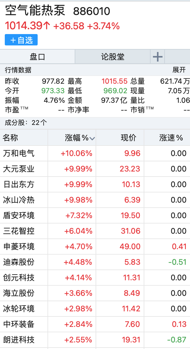 空气能热泵板块尾盘走强,日出东方上演“地天板”,万和电气、大元泵业、冰山冷热涨停,盾安环境、三花智控涨超5%。