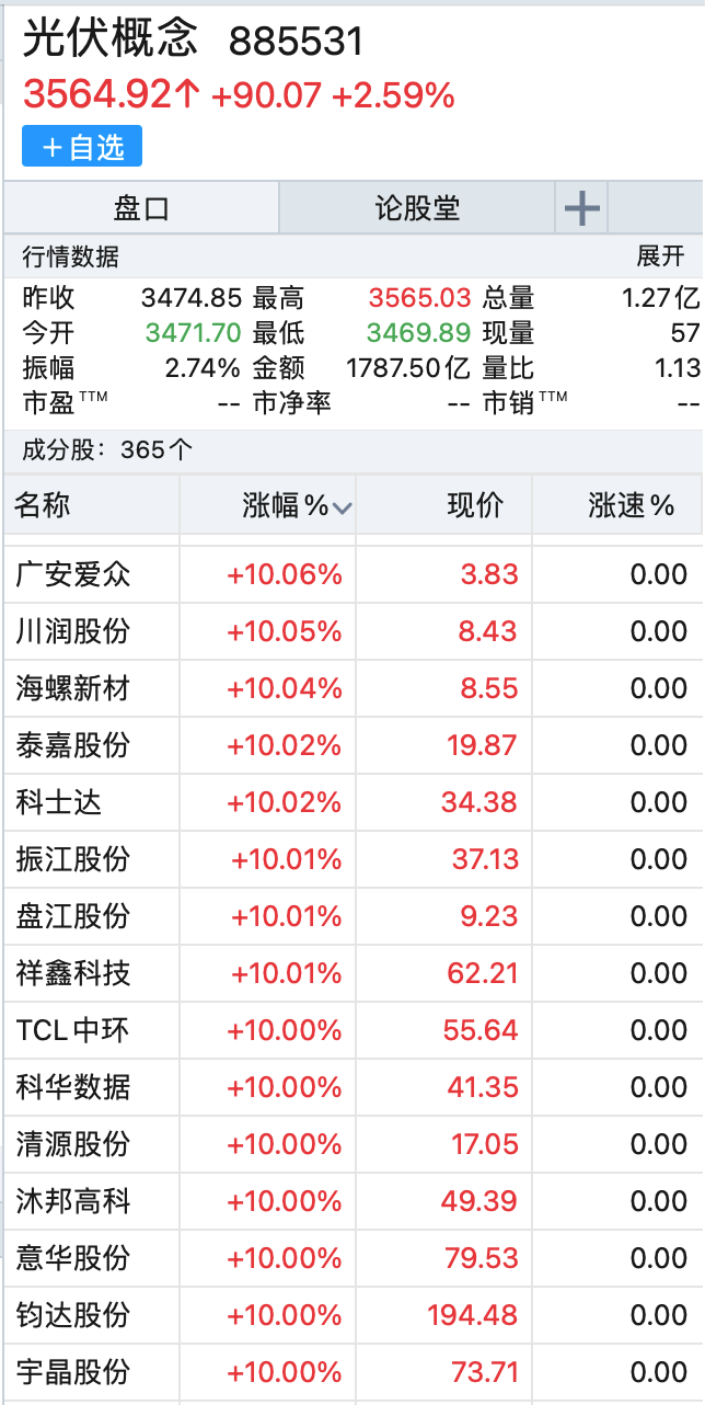 受4000亿光伏巨头拟再次扩产消息影响,光伏概念全天活跃,HJT电池、TOPCON电池方向领涨,钧达股份、沐邦高科、TCL中环涨停,宇邦新材、明冠新材、帝科股份、金刚玻璃等多股涨超5%。