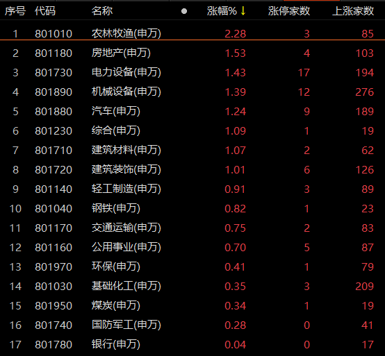 农林牧渔板块午后涨幅扩至超2%,领涨全场,佩蒂股份“20cm”涨停,绿康生化、华资实业涨停;房地产、机械设备、建筑材料、建筑装饰涨幅均超过1%。