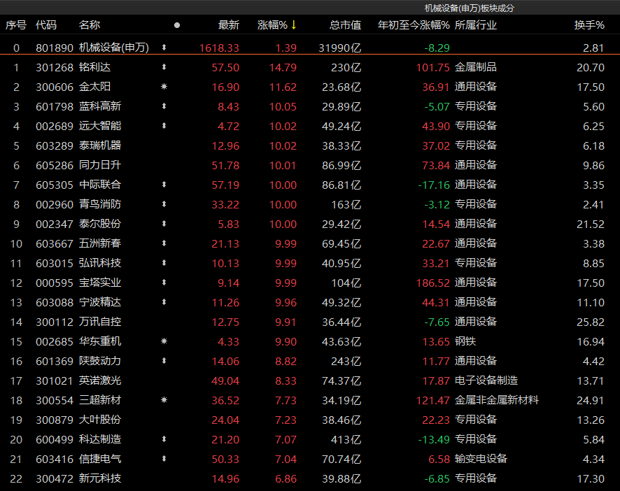 机械设备板块掀起涨停潮,涨停股主要是中小市值个股。蓝光发展、宋都股份、中迪投资、阳光城涨停;蓝科高新、远大智能、泰瑞机器、同力日升、中际联合、青鸟消防、泰尔股份、五洲新春、弘讯科技、宝塔实业等12只个股涨停。