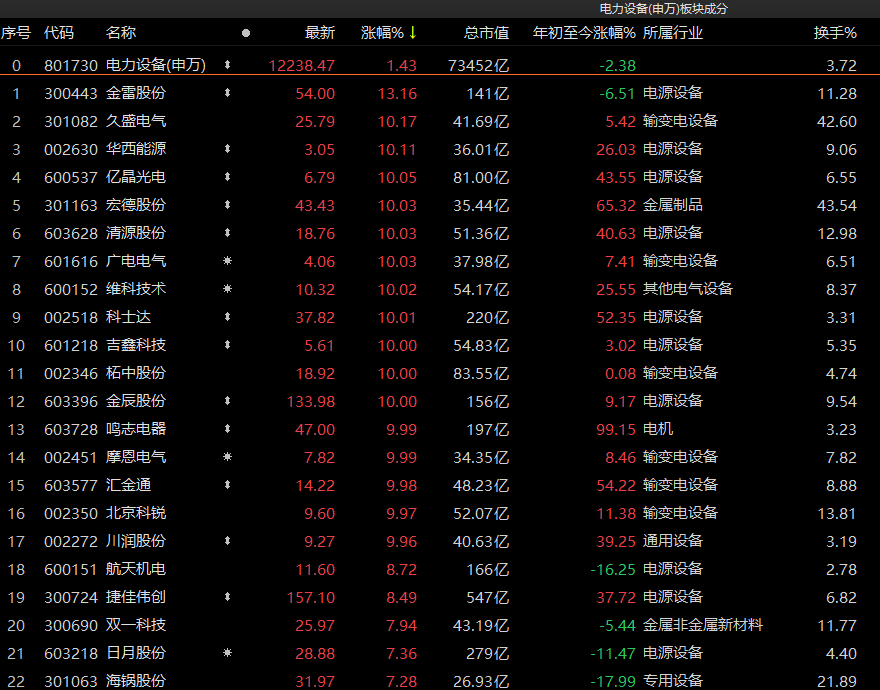 电力设备、汽车热门板块“归来”,华西能源、亿晶光电、清源股份、广电电气等17只个股涨停;迪生力、天龙股份、嵘泰股份等9只汽车股涨停。