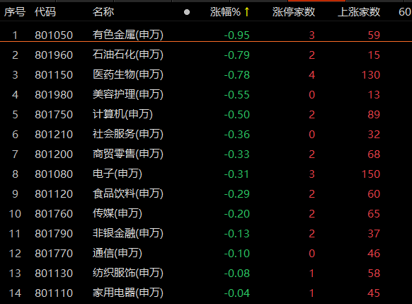 有色金属、石油石化板块跌近1%,大消费类板块仍表现一般,医药生物、美容护理、社会服务、商贸零售、食品饮料板块飘绿。其中,贵州茅台收跌0.11%报1917.84元/股。