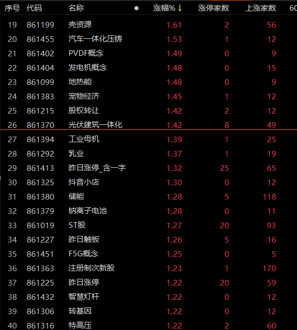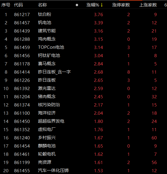 钛白粉、钒电池、建筑节能、鸡肉概念、钙钛矿电池涨幅均超过3%,攀钢钒钛、振华股份、南网能源、山东赫达、今辰股份等个股涨停。轮毂电机、汽车一体化压铸等汽车相关概念走强,光伏建筑一体化、储能“归来”。