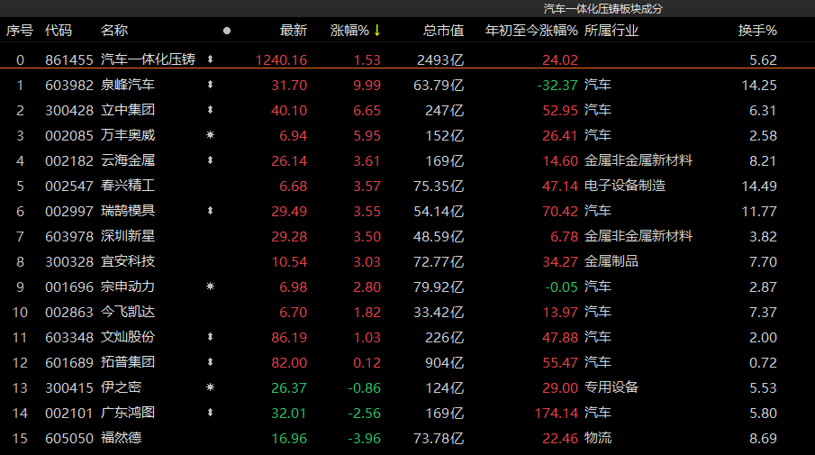 汽车一体化压铸概念板块收涨1.53%,泉峰汽车涨停,立中集团、万丰奥威大涨。