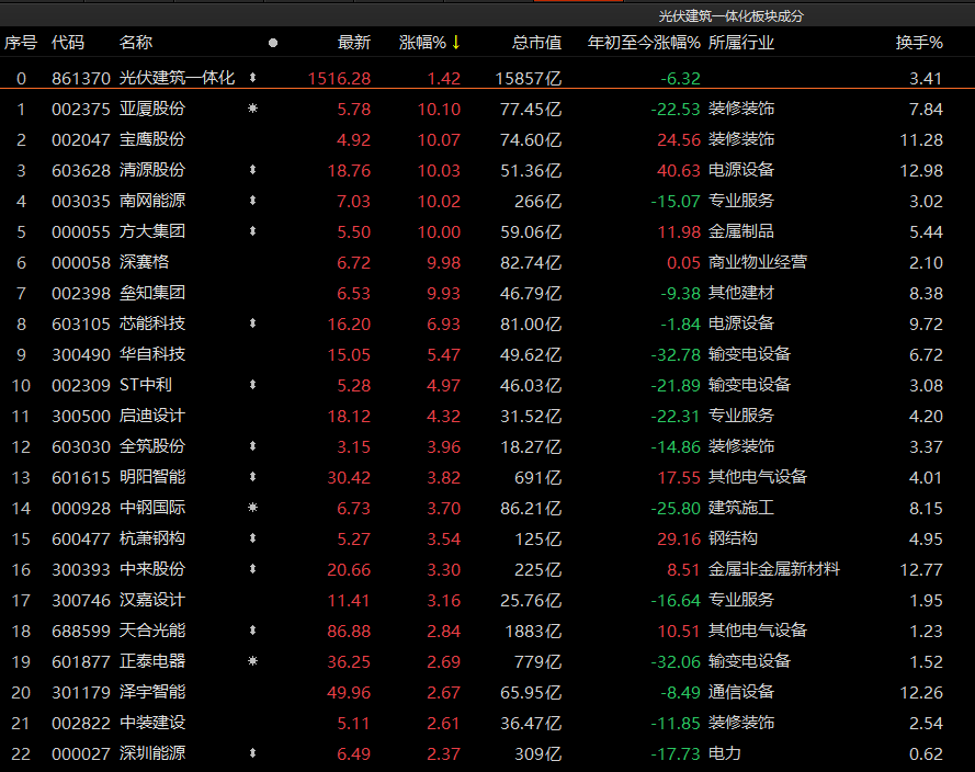 光伏建筑一体化概念也表现不错,亚厦股份、宝鹰股份、清源股份、南网电源、方大集团、深赛格、垒知集团涨停。隆基绿能微涨0.55%报60.39元/股,天合光能收涨2.84%报86.88元/股。